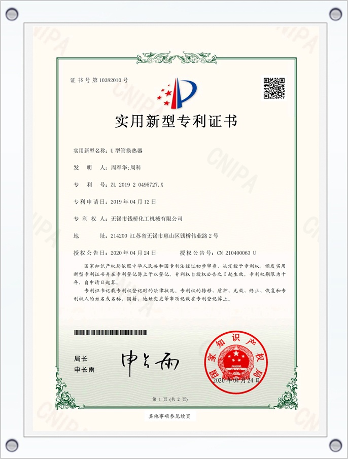 U型管換熱器專利證書