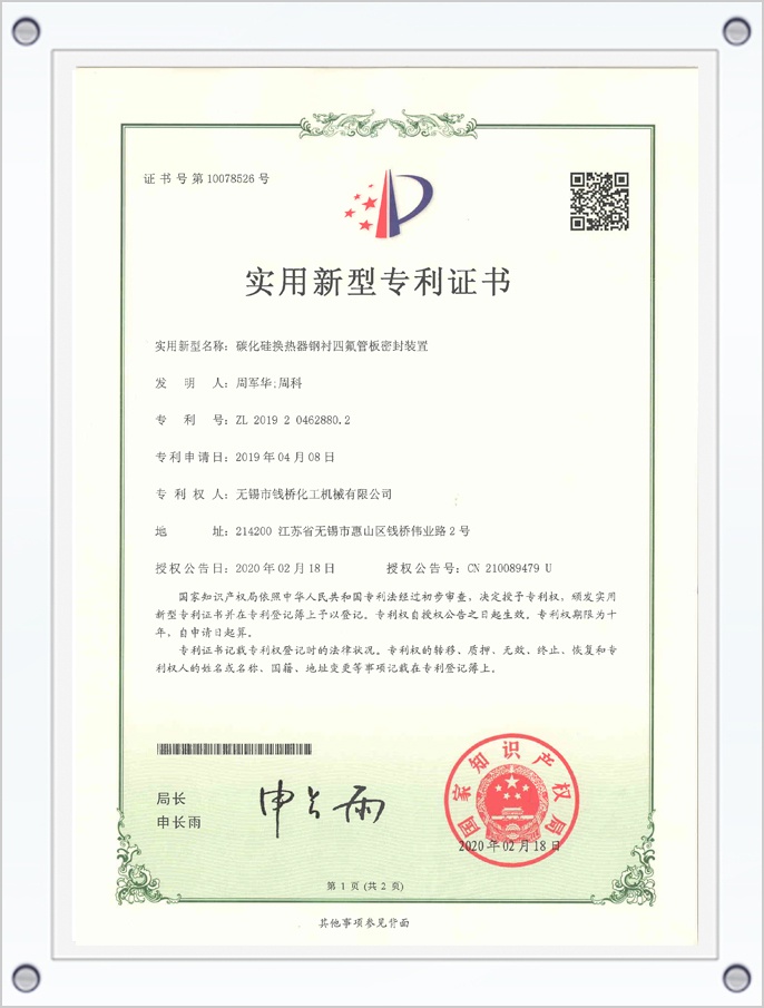 碳化硅換熱器鋼襯四氟管板密封裝置專利證書