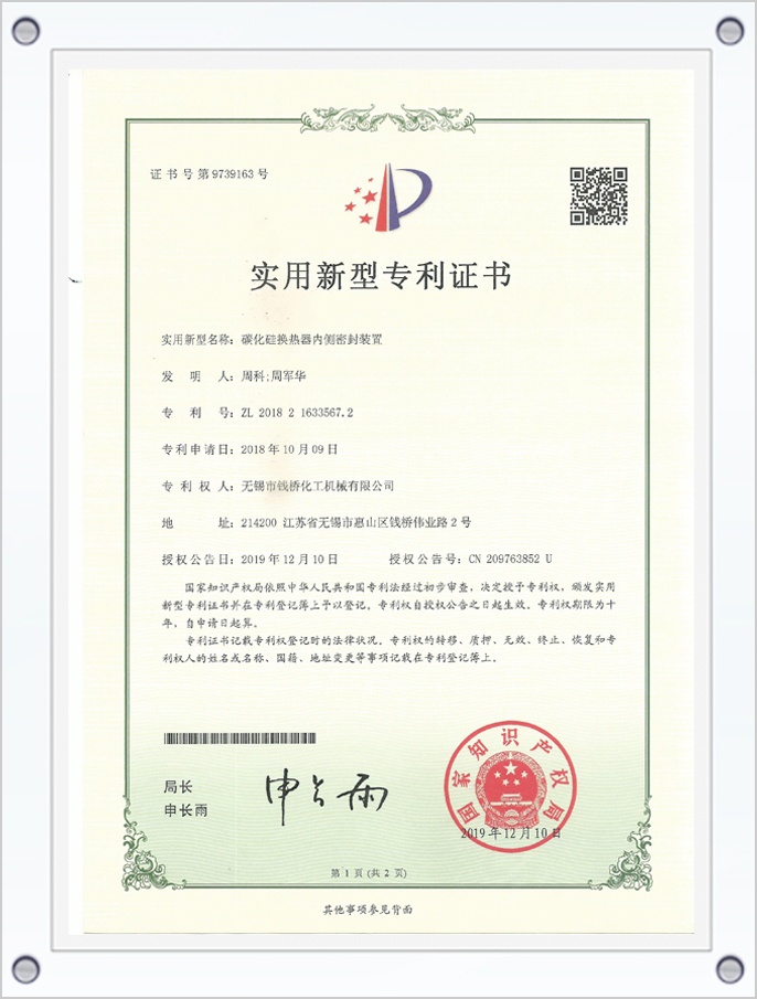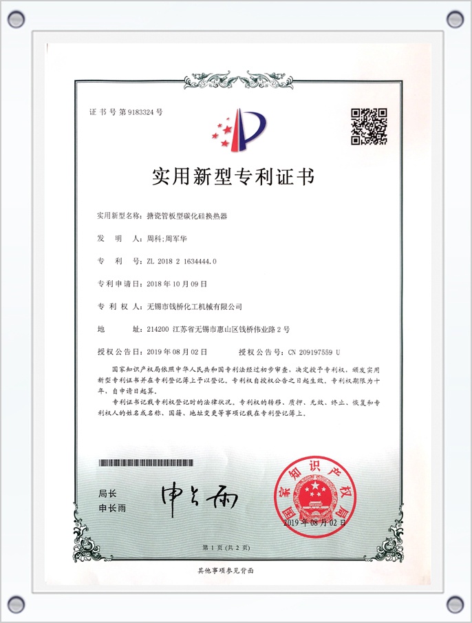 搪瓷管板型碳化硅化熱器專利證書