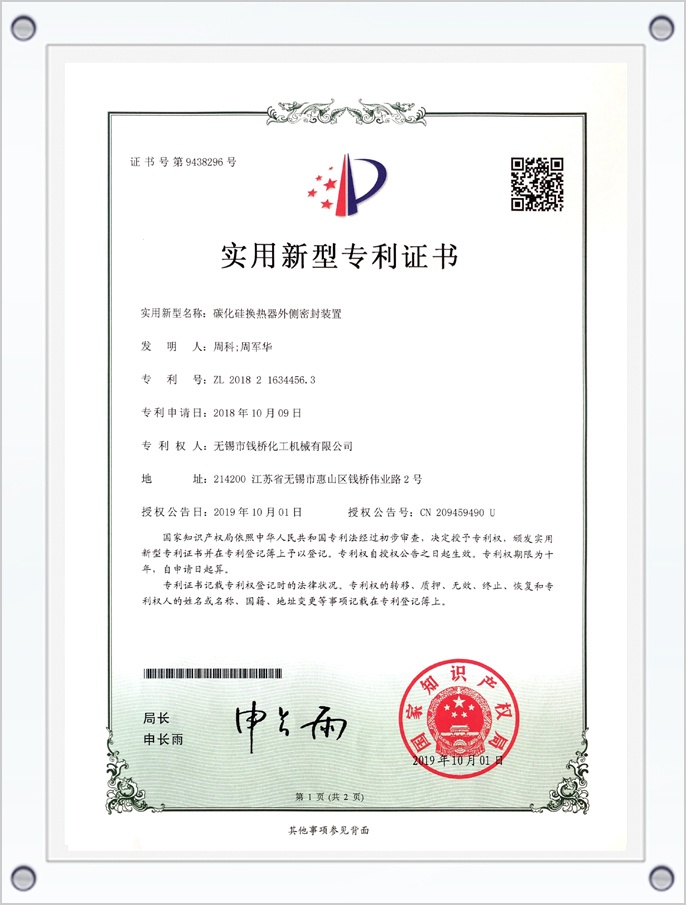碳化硅換熱器外側(cè)密封裝置專利證書
